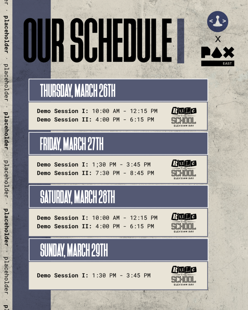 The PAX Together Demo Days program has given myself and other designers the opportunity to show off our games to the public!! I’ll be there ALL weekend to demo our game, Rule the School! So if you’re in the area, please stop by and say hi!