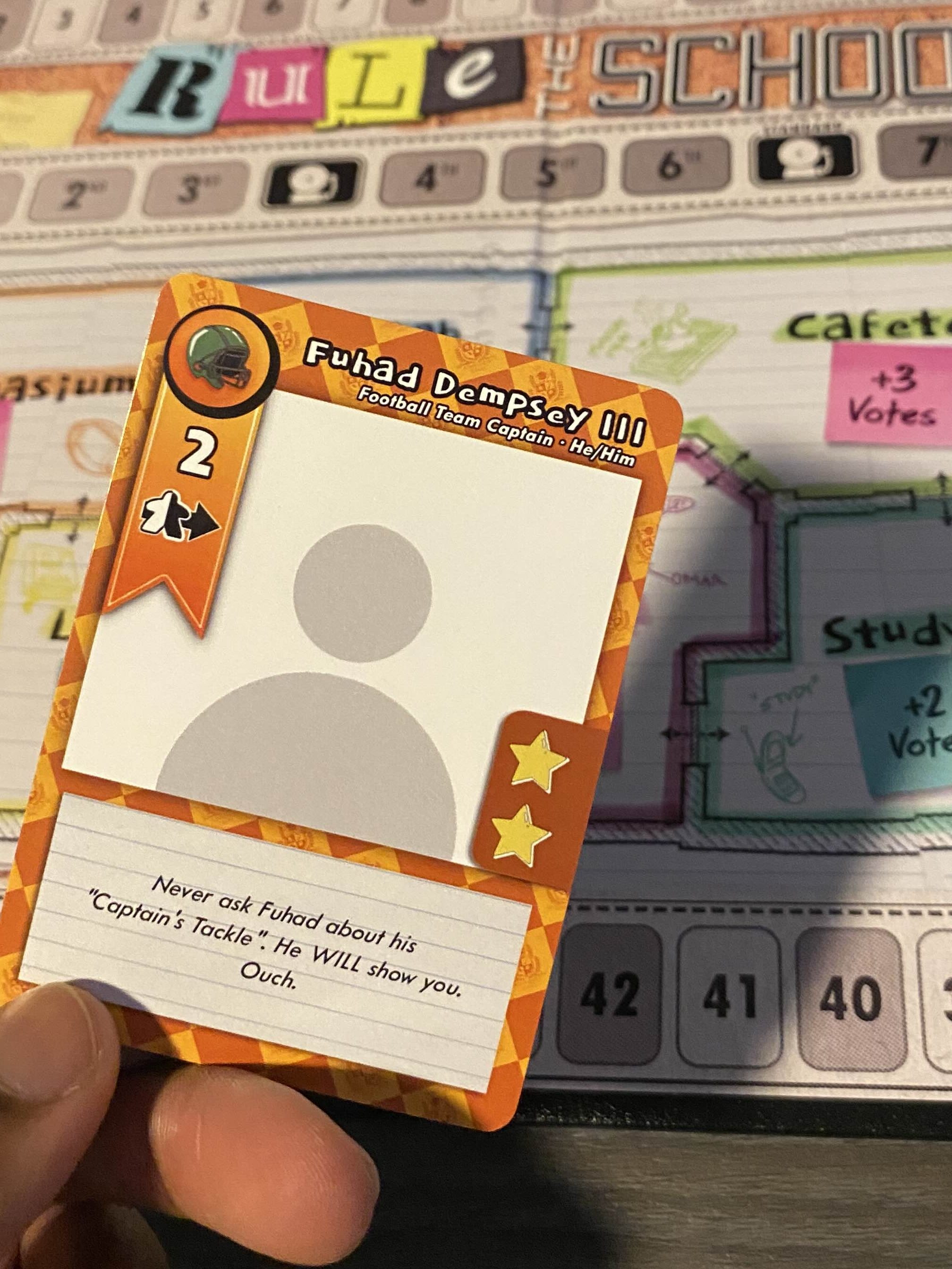 Rule the School: Senior Year is played over 6-8 rounds (that we call Periods). During which, players will play cards into their tableaus: chaining abilities and manipulating Supporter tokens on the game board. Every third, sixth, and eighth Period, a Scoring Period occurs, where each player’s majorities are tallied. Whoever has the highest number of votes by the final scoring Period is Bakersfield High’s new student body president.